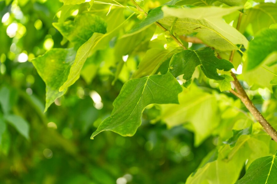 - De Amerikaanse tulpenboom heeft kenmerkende tulpvormige bladeren die in de herfst prachtig geel kleuren.