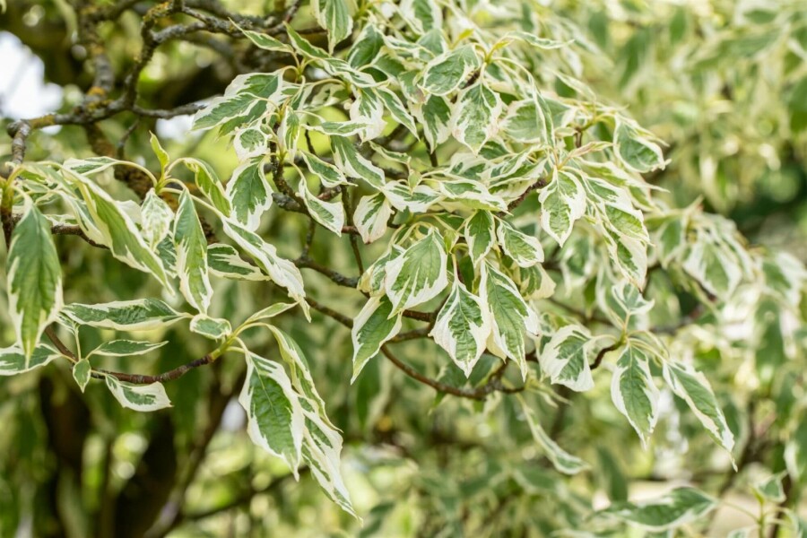 • De Cornus controversa 'Variegata' is een bladverliezende boom met een ronde kroon en een kenmerkende etagevormige vertakking.