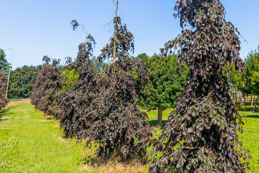 - De Fagus sylvatica 'Purple Fountain' heeft een distinctieve treurvorm met een smalle, sierlijke kroon.