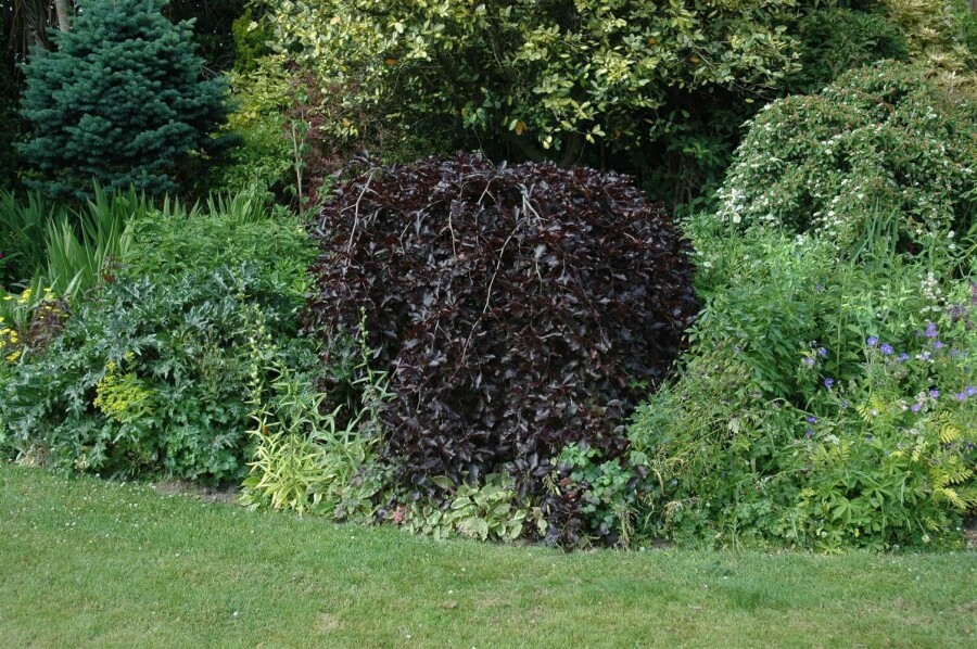 - De Fagus sylvatica 'Purpurea Pendula' heeft een kenmerkende treurvormige kroon die breed uitgroeit.