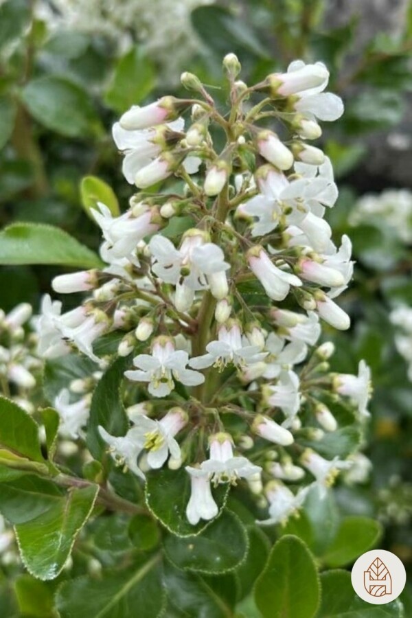 - Escallonia 'Iveyi' bloeit van juni tot augustus met zuiver witte bloemen die aantrekkelijk zijn voor bijen en vlinders.