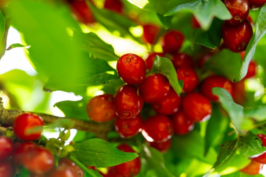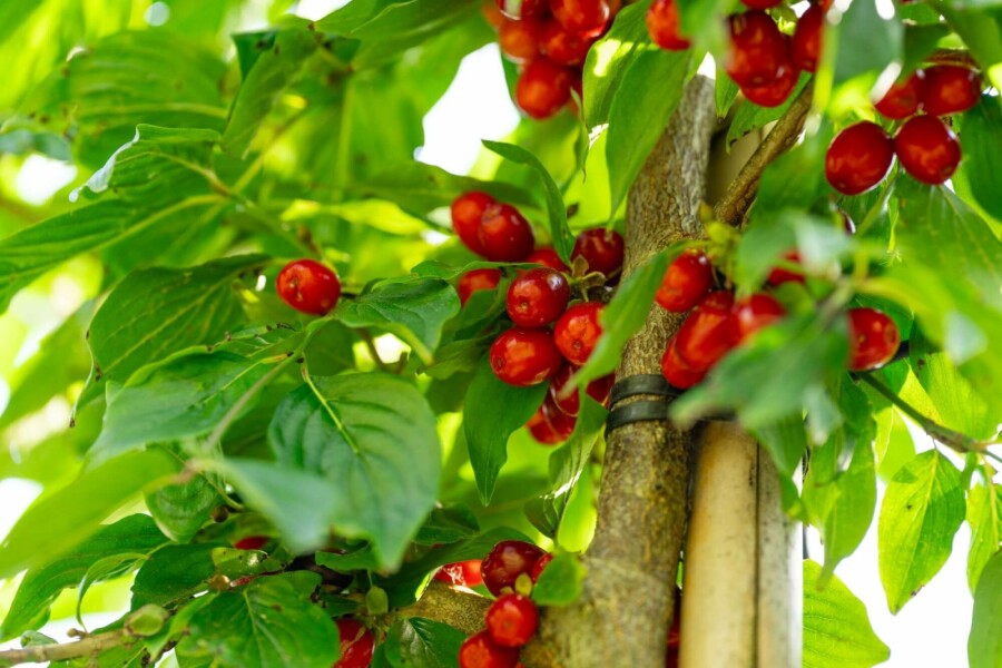 - In de zomer en herfst draagt de boom glanzende, rode vruchten die eetbaar zijn en geliefd bij vogels.