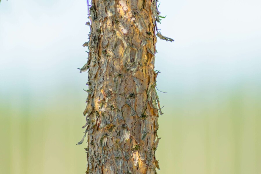De Pinus sylvestris heeft een grijze, bruine en afbladderende schors.