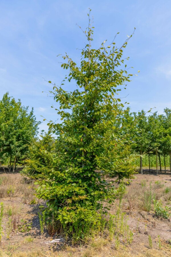 De Carpinus betulus, ook wel bekend als de haagbeuk of gewone haagbeuk, is een inheemse loofboom met een opvallende verschijning. Deze boom heeft een piramidale, eironde of ronde kroonvorm en een gladde, grijze tot groenbruine schors. Het blad is frisgroen van kleur en verkleurt in de herfst naar geel. In april en mei verschijnen de kleine, geelgroene bloemen, gevolgd door de kenmerkende vruchtjes. De Carpinus betulus kan een volwassen hoogte bereiken van 15 tot 20 meter en een breedte van meer dan 8 meter. Het is een traag groeiende boom die meer dan 50 jaar nodig heeft om zijn uiteindelijke omvang te bereiken. Desondanks is het een sterke boom met een goede windbestendigheid. De haagbeuk is winterhard tot -23,3°C en gedijt in zowel zon als schaduw. Hij is geschikt voor verschillende grondsoorten, variërend van lichtzuur tot kalkrijk. In het landschap kan de Carpinus betulus worden toegepast als haagplant, in bermen, op rotondes, in groenstroken, op taluds of als solitaire boom. De boom is verkrijgbaar in diverse vormen, waaronder hoogstam, beveerd, meerstammig en als leiboom.