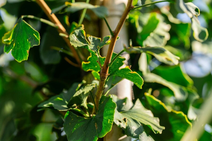 - De Ginkgo biloba heeft een unieke waaiervormige bladstructuur die in de herfst prachtig geel kleurt.