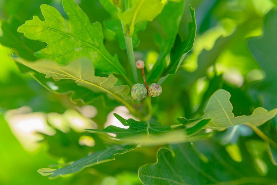 - Deze bladverliezende boom produceert onopvallende geelgroene bloemen in mei, gevolgd door eikels in de herfst.