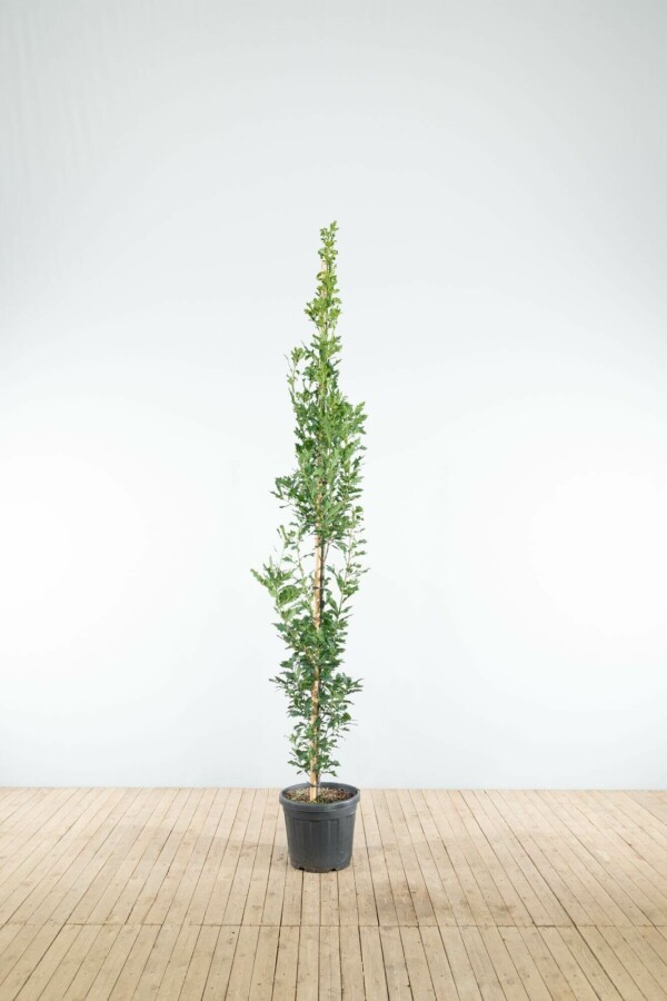 De Quercus robur 'Fastigiata Koster', ook bekend als de zomereik, is een indrukwekkende loofboom met een opvallende zuilvormige kroon. De schors van deze eik is groen als de boom jong is, maar verkleurt naar bruin en wordt diep gegroefd naarmate de boom ouder wordt. De bladeren zijn frisgroen en hebben een bronzen tint wanneer ze uitlopen in de lente. In de herfst verkleuren de bladeren naar bruin voordat ze afvallen, waardoor de Quercus robur 'Fastigiata Koster' een bladverliezende boom is. Deze cultivar kan een indrukwekkende hoogte van 15 tot 20 meter bereiken, terwijl de kroon slechts 1,5 tot 2,5 meter breed wordt. Met een gemiddelde groeisnelheid duurt het meer dan 50 jaar voordat de boom zijn volledige hoogte bereikt. In mei produceert de boom kleine, geelgroene bloemen, die later in de herfst plaats maken voor bruine eikels. De Quercus robur 'Fastigiata Koster' is een veelzijdige boom die geschikt is voor verschillende toepassingen in tuinen en openbare ruimtes, zoals straatboom, laanboom, solitair, of als windkering. Deze cultivar is zeer winterhard en kan goed tegen stedelijke omstandigheden en verharding.