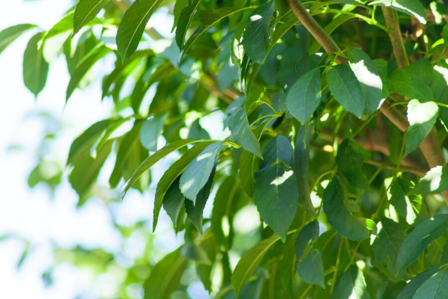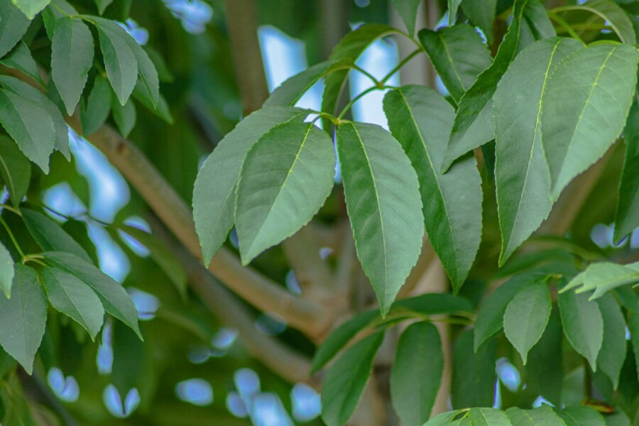 - De boom heeft een gladde, grijsbruine schors en frisgroene bladeren.