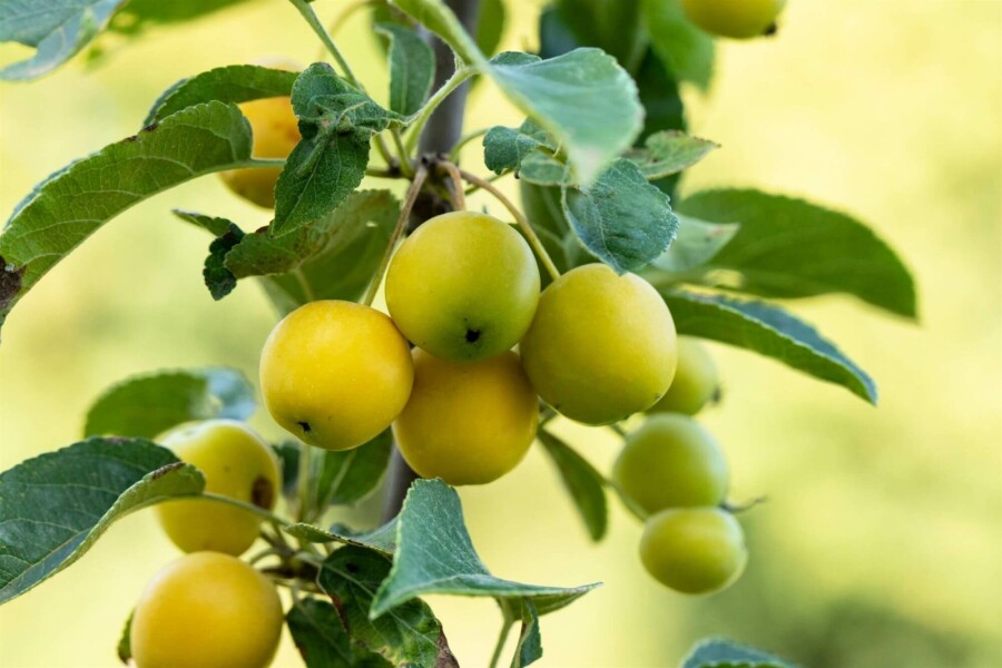 - In het voorjaar pronkt de sierappel met een overvloed aan witte bloemen, die later plaats maken voor opvallende gele vruchten.