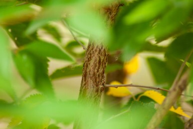 De Prunus incisa 'The Bride' heeft een grijze, bruine en gegroefd schors.