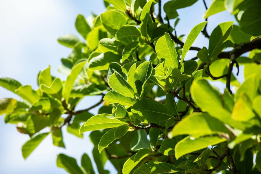 • De enkelvoudige bladeren van de stermagnolia zijn frisgroen en vallen in de herfst af.