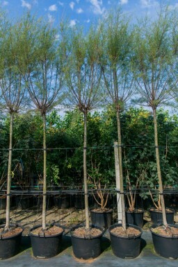 De Tamarix tetrandra, ook bekend als tamarisk, is een loofboom met een vaasvormige kroon en fijne, vedervormige bladeren die een sierlijke uitstraling geven. Van april tot juni produceert de boom prachtige, lichtroze bloemen die bestuivers aantrekken en een charmante toevoeging zijn aan elke tuin of landschap. De tamarisk is winterhard en goed bestand tegen wind, waardoor hij geschikt is voor verschillende toepassingen, waaronder parken, groenstroken, grote en kleine tuinen en kustgebieden. Dankzij zijn uitgebreide wortelstelsel wordt de boom vaak gebruikt voor erosiebestrijding en het stabiliseren van zanderige bodems. Bovendien maakt de tolerantie van de tamarisk voor zout en kustomstandigheden hem tot een waardevolle keuze voor beplanting aan zee. Met zijn veelzijdige eigenschappen en aantrekkelijke uiterlijk is de Tamarix tetrandra een aanwinst voor elke groene ruimte.