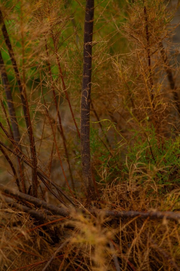 De Tamarix tetrandra heeft een zwarte, gegroefd schors.