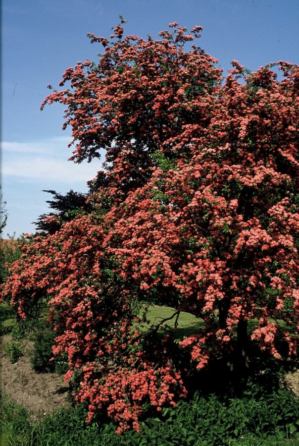 De Crataegus laevigata 'Paul's Scarlet', ook wel bekend als rode meidoorn, is een opvallende struik met prachtige rood-roze bloemen die bloeien in mei en juni. Deze bladverliezende struik heeft een opgaande groeiwijze en kan uiteindelijk een hoogte van 7 meter bereiken. De rode meidoorn is perfect voor gebruik als solitaire plant of als onderdeel van een border en gedijt goed in zowel zonnige als halfschaduwrijke locaties.
