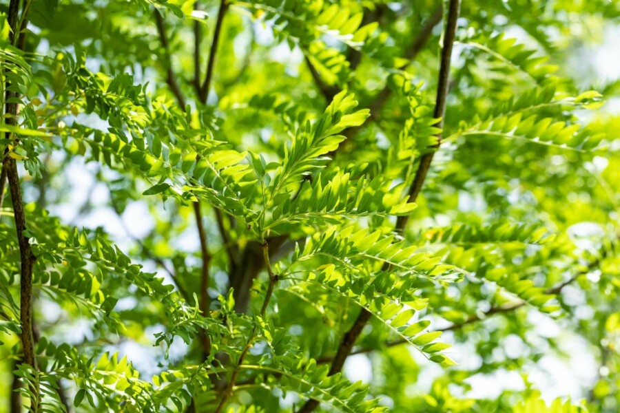 • De gladde, grijze schors van de valse Christusdoorn vormt een aantrekkelijk contrast met het frisse, groene blad.