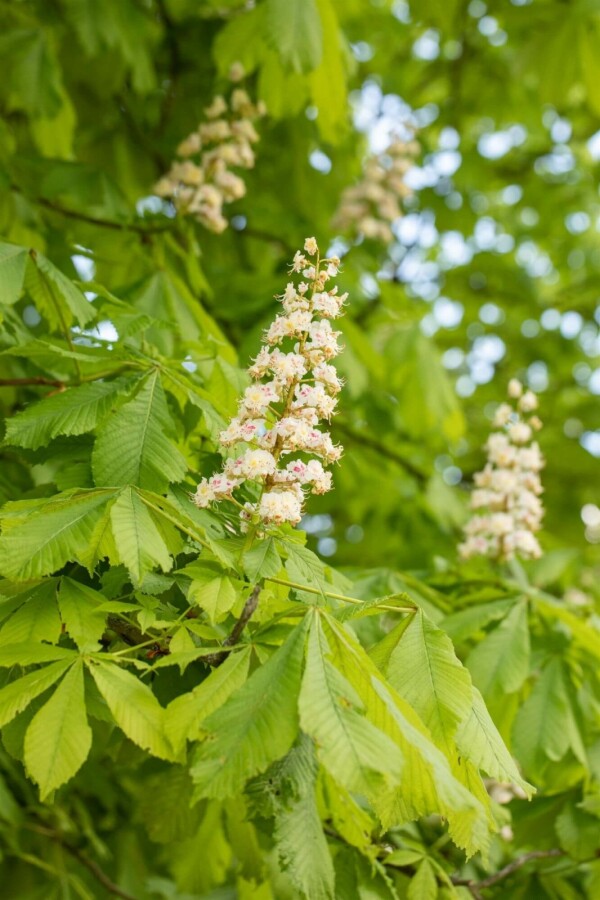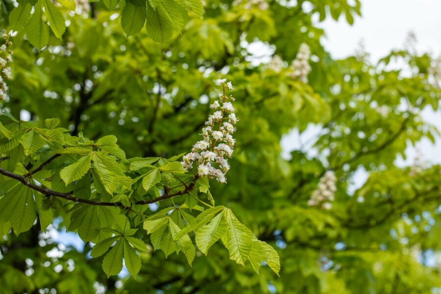 • De witte paardenkastanje bloeit in mei en juni met opvallende witte bloemen in rechtopstaande trossen.