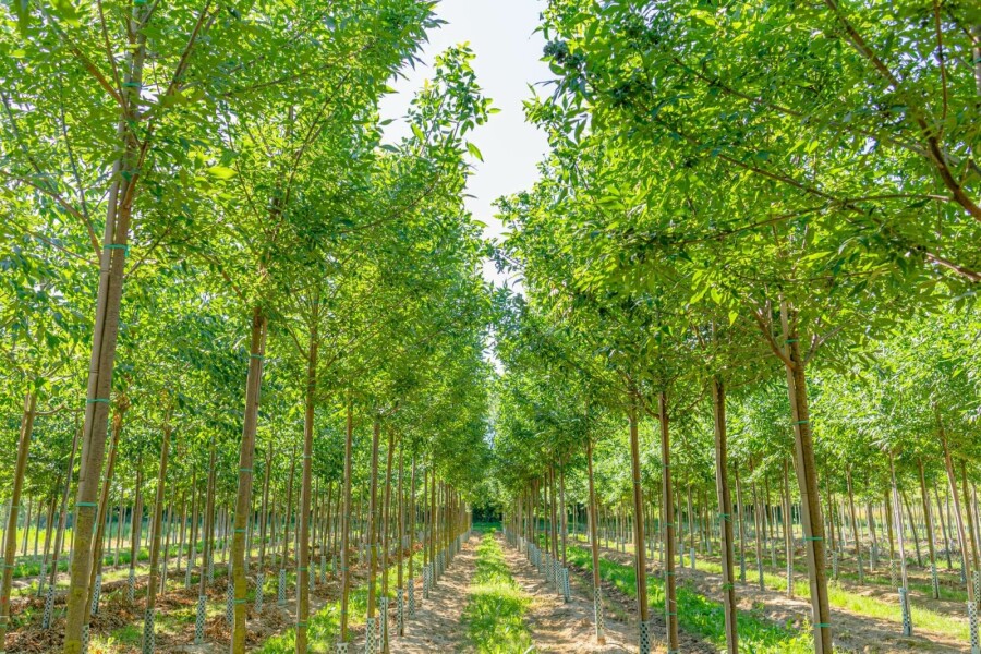 De Fraxinus pennsylvanica 'Summit', ook bekend als de zachte es, is een indrukwekkende loofboom afkomstig uit het oosten en midden van Noord-Amerika. Deze cultivar van de Fraxinus pennsylvanica onderscheidt zich door zijn ovale tot ronde kroonvorm en kan een volwassen hoogte bereiken van 10 tot 16 meter. De schors is grijs tot bruin van kleur, glad als de boom jong is en wordt met de jaren gegroefd. Het blad is groen en geveerd samengesteld, wat betekent dat elk blad bestaat uit meerdere deelblaadjes. In april produceert de boom kleine, geelgroene bloemen die later uitgroeien tot gevleugelde vruchten, ook wel bekend als samara's. De zachte es is een bladverliezende boom, wat betekent dat hij zijn bladeren in de winter verliest. Met zijn sterke groeikracht en resistentie tegen windschade is de Fraxinus pennsylvanica 'Summit' een toekomstbestendige en klimaatbestendige boom die goed gedijt in volle zon en een licht zure bodem verdraagt. Deze veelzijdige boom is uitermate geschikt voor grote tuinen, parken, lanen, straatbeplanting en windsingels, en is verkrijgbaar als hoogstam.