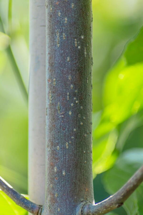 - De schors is grijs tot bruin van kleur, glad als de boom jong is en wordt met de jaren gegroefd.