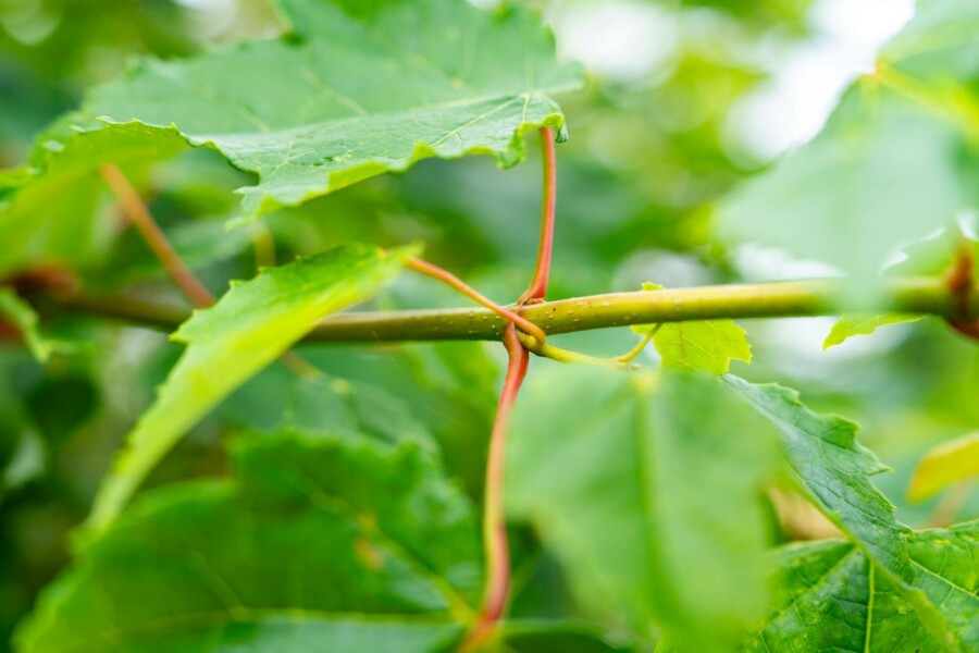 - De bladeren zijn heldergroen en hebben een diep gelobde vorm, die in de herfst prachtig geel en rood kleurt.